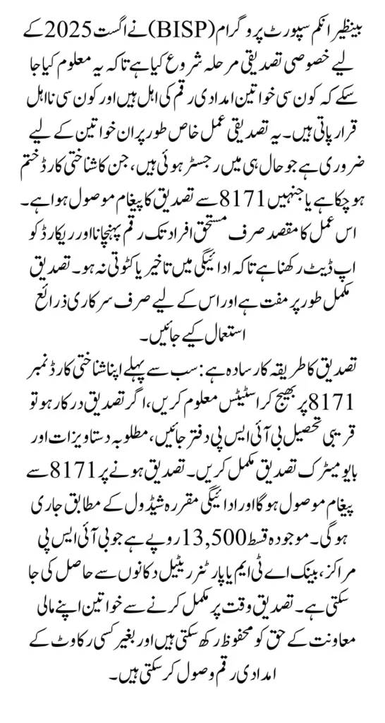 BISP 8171 Verification January 2025 to Identify Eligible and Ineligible Women for Payments. The BISP 8171 January 2026 Verification is a key process to ensure that financial aid continues to reach the most deserving low-income families in Pakistan. This year, the verification drive focuses on identifying women who are eligible to receive Rs. 13,500 payments and those who no longer qualify.